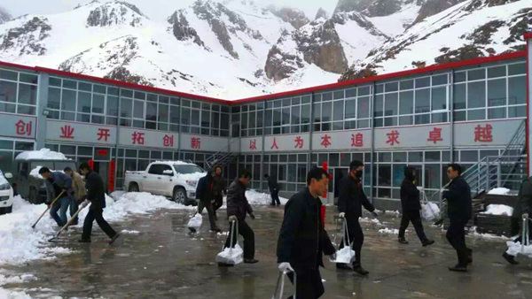 2016年3月21日青海共和縣青海銅鑫礦業(yè)有限公司礦區迎來(lái)了自春節以來(lái)的第一場(chǎng)大雪,前幾這里還太陽(yáng)高照,天氣晴朗,與此同時(shí)洛陽(yáng)陽(yáng)光明媚,鳥(niǎo)語(yǔ)花香,現在青海銅鑫礦區則被厚厚的白雪覆蓋,呈現出另一番別樣的景像。青海分公司員工也一起參加礦山工作區的除雪工作,個(gè)個(gè)干得熱火朝天,一會(huì )兒大院里的雪就被清理完畢。